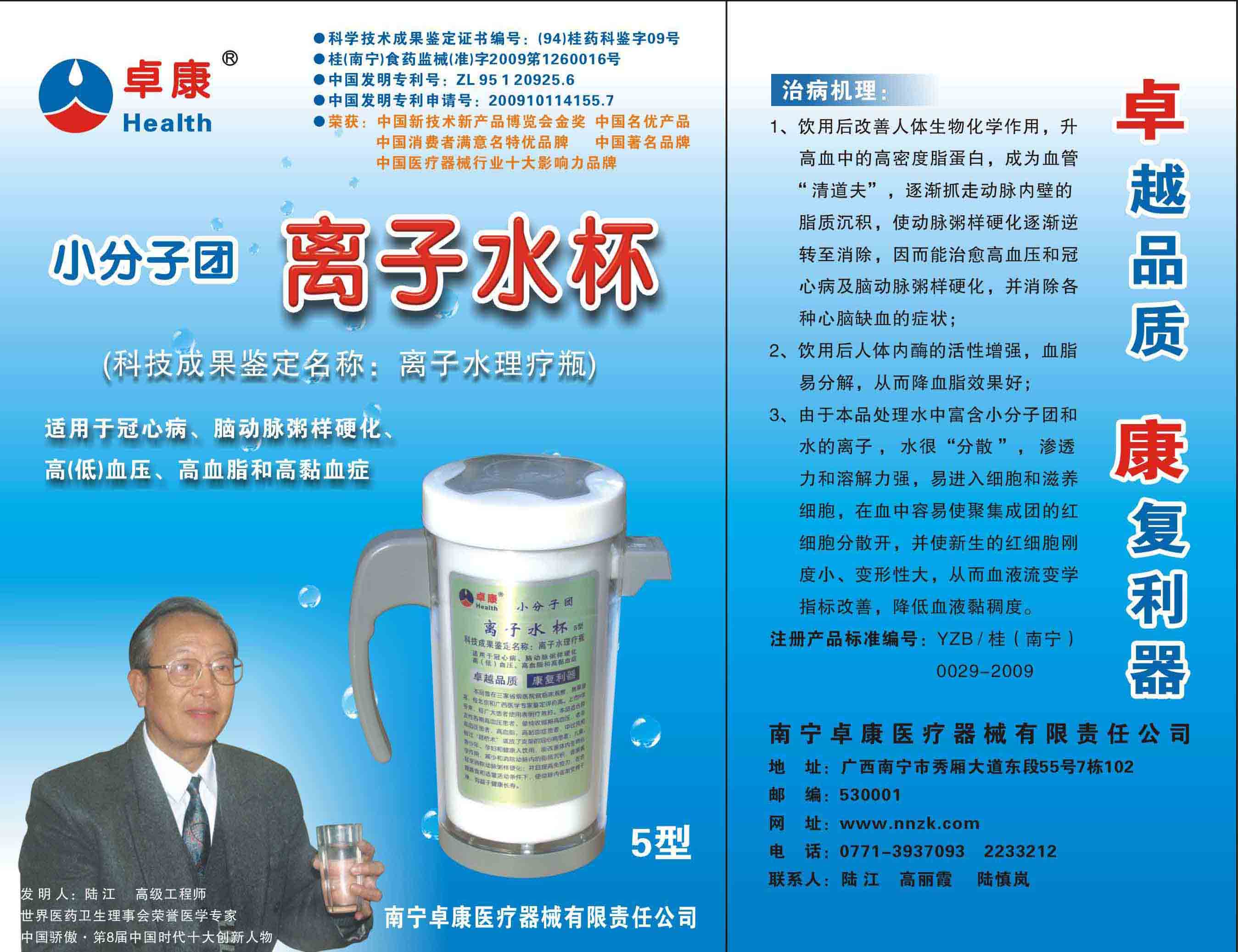 -----我是從事建筑的高工,本來沒有資格去攻克醫(yī)學(xué)難題,卻為了自身健康才扣響醫(yī)學(xué)的大門。由于我1990年患高血壓,因怕中風(fēng)才研究發(fā)明了離子水瓶,我把水處理成微小分子團水,飲用后治愈了高血壓。便于1993年底送到三家省級醫(yī)院做臨床試用4個月。經(jīng)北京和廣西醫(yī)學(xué)專家鑒定:"降脂降壓效果好"," 能擴大心腦動脈流量,改善心腦電圖以及微循環(huán)","對治療心腦動脈粥樣硬化、高血壓、高血脂有良好的醫(yī)療保健作用。""產(chǎn)品的技術(shù)性能和療效達到了同類產(chǎn)品的國內(nèi)領(lǐng)先水平,經(jīng)廣西醫(yī)學(xué)科學(xué)情報研究所檢索,未見國外有類似報道。"中國醫(yī)學(xué)科學(xué)院張正國教授從美國國立醫(yī)學(xué)圖書館數(shù)據(jù)庫存Medline檢索英俄文資料,均未見類似報告。2000年上市后,我為了對消費者負責(zé)而繼續(xù)觀察研究,一直通過《信譽卡》和《質(zhì)量跟蹤調(diào)查書》向患者承諾療效,請用戶使用6個月后反饋效果。和脂壓患者飲用2至5個月內(nèi),消除癥狀,停服藥物,血壓正常;冠心病患者飲用3~5個月逐漸減輕至消除心絞痛、房顫等癥狀,不再服藥,飲用1年左右心電圖正常,經(jīng)冠脈造影掃描無明顯狹窄,表明冠心病痊愈。大量患者還反映許多衰弱器官被修復(fù),讓前列腺增生、慢性咽喉炎、慢性氣管炎、支氣管炎、慢性胃炎、腸炎和膽囊炎等不藥而愈;2型糖尿病患者是因為胰島衰弱致病,飲用該水半年至一年,逐漸減藥至停藥,血糖尿糖正常,真正治愈2型糖尿病。中風(fēng)后遺癥患者飲用六七個月,可逐漸減輕至消除肢體和語言障礙,表明飲用該水能讓壽命很長的神經(jīng)元細胞逐漸修復(fù),奇跡般地恢復(fù)肢體和語言功能。飲用后還使胸腺和脾臟兩個重要的免疫器官被修復(fù)和增強,產(chǎn)生免疫細胞多,提高了免疫力,使人不生病或少生病。自此, 飲用微小分子團水創(chuàng)造了攻克冠心病、高(低)血壓和糖尿病三大醫(yī)學(xué)難題的奇跡。人們對此感到不可思議,但實踐是檢驗真理的唯一標準。